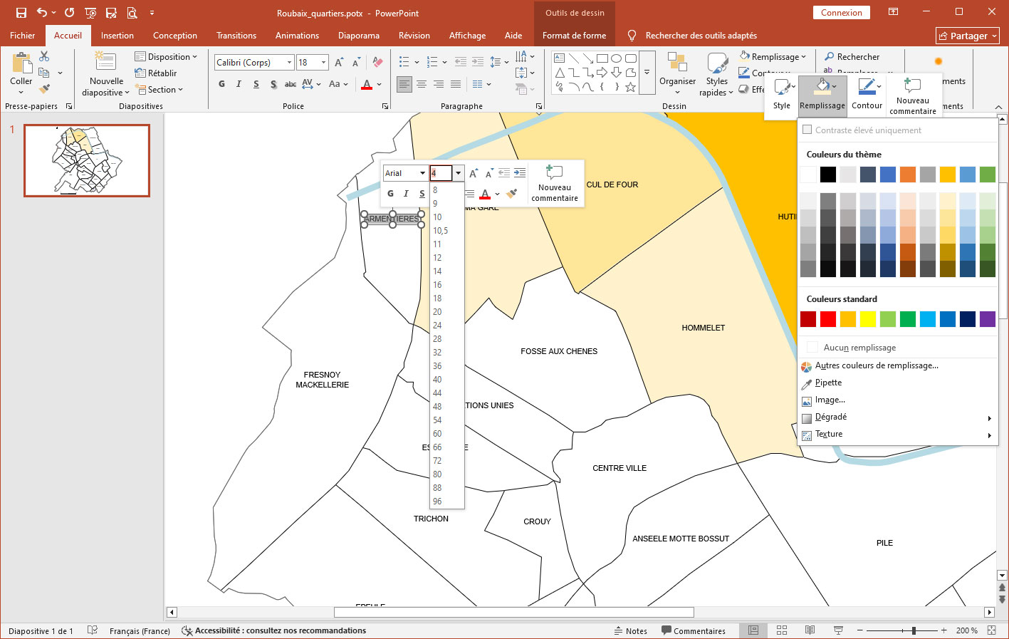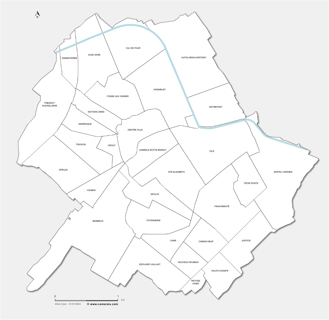 Customizable map of Roubaix districts for office use (Microsoft PowerPoint or LibreOffice Impress) and for infographics (Illustrator and layered PDF).